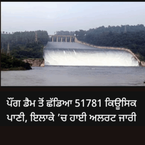 ਪੌਂਗ ਡੈਮ ਤੋਂ ਅੱਜ 51781 ਕਿਊਸਿਕ ਪਾਣੀ ਸ਼ਾਹ ਨਹਿਰ ਬੈਰਾਜ ਵਿਚ ਛੱਡਿਆ ਗਿਆ ਹਾਈ ਅਲਰਟ ਜਾਰੀ ਕਰ ਦਿੱਤਾ ਗਿਆ ਹੈ।